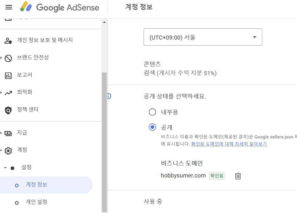 구글애드센스 / 계정 / 설정 / 계정정보에서