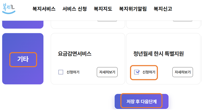 5) 제일 밑으로 스크롤해서 내려서, 기타항목에 "청년월세 한시 특별지원" 신청하기 클릭